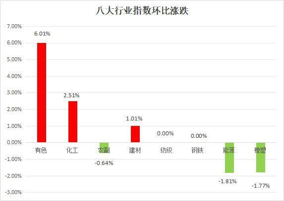 生意社监测的8 个行业,本周跌多涨少,上涨的分别是有色行业,涨幅为2.35%,化工行业,涨幅为0.39%,农副行业,涨幅为0.32%。下跌前三的分别是橡塑行业,跌幅为-0.89%,能源行业,跌幅为-0.37%,钢铁行业,跌幅为-0.36%。