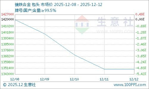 近期镝铁合金价格下跌。因龙头企业产能不断释放,原料充足致供给宽松;库存高企,年末贸易商为回笼资金降价抛货;下游领域需求短期疲软,叠加市场信心不足,推动价格走低。预计短期价格走势震荡。